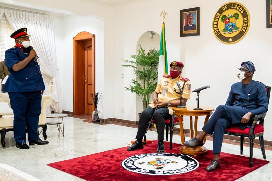 Pictures: Governor Sanwo-Olu receives newly deployed FRSC sector Commander and NSCDC State Commandant, at Lagos House, Marina, Lagos on Thursday, July 23, 2020