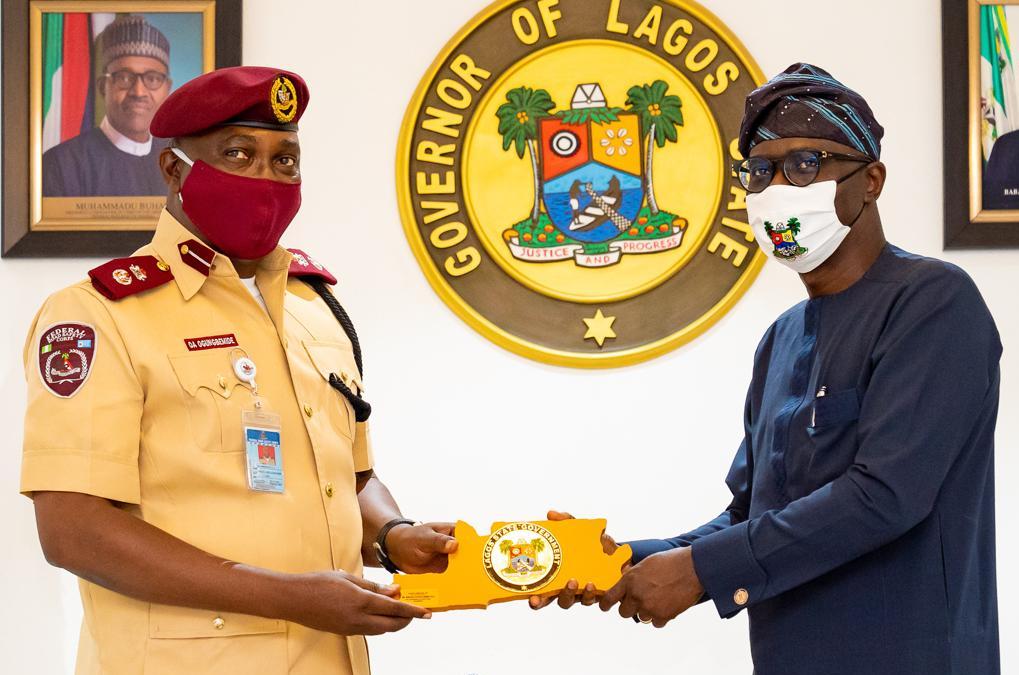 L-R: Sector Commander, Federal Road Safety Corps (FRSC) in charge of Lagos, Mr. Olusegun Ogungbemide, receiving a souvenir from Lagos State Governor, Mr. Babajide Sanwo-Olu