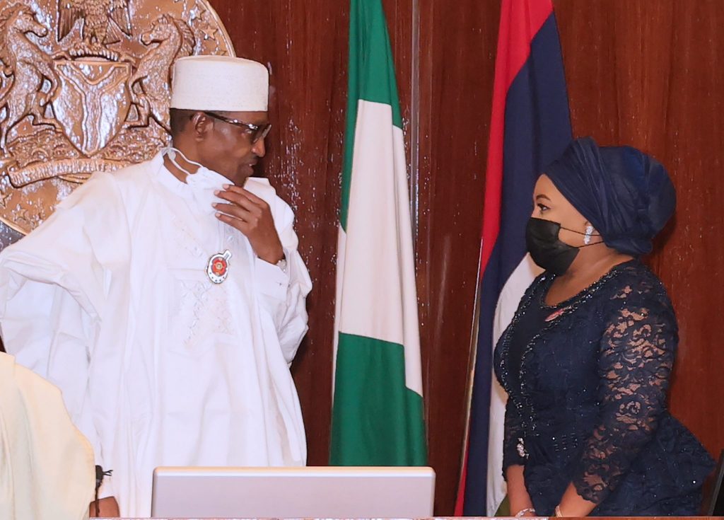 PRESIDENT BUHARI INAUGURATES NEW NNPC BOARD & MAGT 0A L-R; President Muhammadu Buhari chats with Wife of Former President of the Senate, Late Rt Hon Chuba Okadigbo Chairman of the NNPC Board, Senator Chuba Okadigbo during the Inauguration of the NNPC Board and Management in State House Abuja. PHOTO; SUNDAY AGHAEZE. JAN 7TH 2022