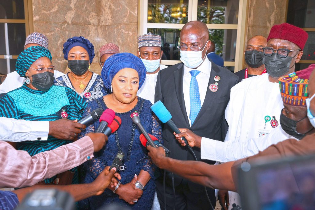 PRESIDENT BUHARI INAUGURATES NEW NNPC BOARD & MAGT 12A. ADDRESSING THE PRESS; Chairman of the Board, Senator Chuba Okadigbo, Minister of State Petroleum, Sylva Timipre, Chief Executive Officer Mele Kolo Kyari, Chief Financial Officer, Alh Umar I. Ajiya, Dr Tajudeen Umar and Mrs Lami O. Ahmed during the Inauguration of the NNPC Board and Management in State House Abuja. PHOTO; SUNDAY AGHAEZE. JAN 7TH 2022