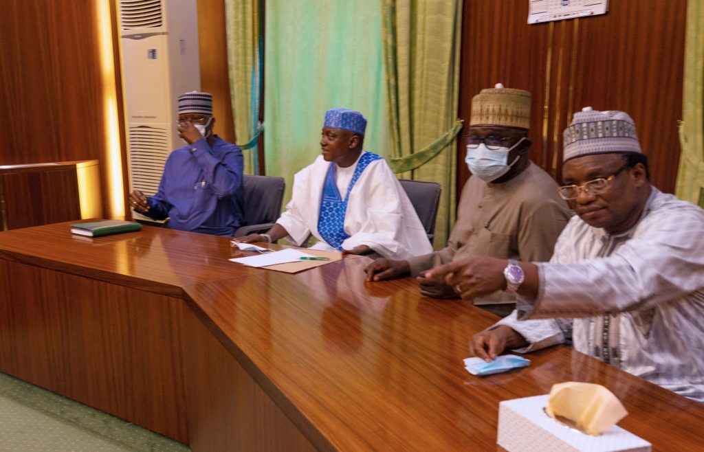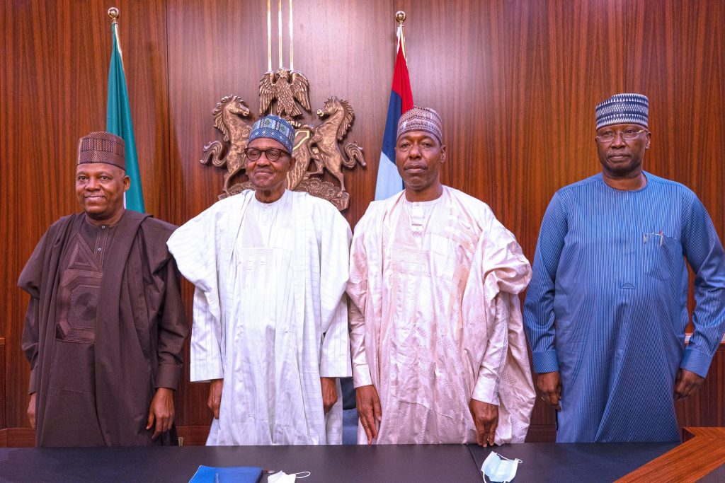 PRESIDENT BUHARI RECEIVES IN AUDIENCE APC VP CANDIDATE SEN SHETTIMA 4.-From Left; APC Vice Presidential Candidate, Sen Kashim Shettima, President Muhammadu Buhari, Borno State Governor, Prof Babagana Zulum and SGF Mr. Boss Mustapha during an audience at the State House Abuja. PHOTO; SUNDAY AGHAEZE. JUL;Y 20TH 2022