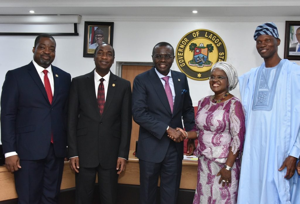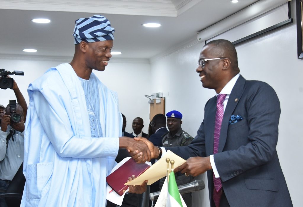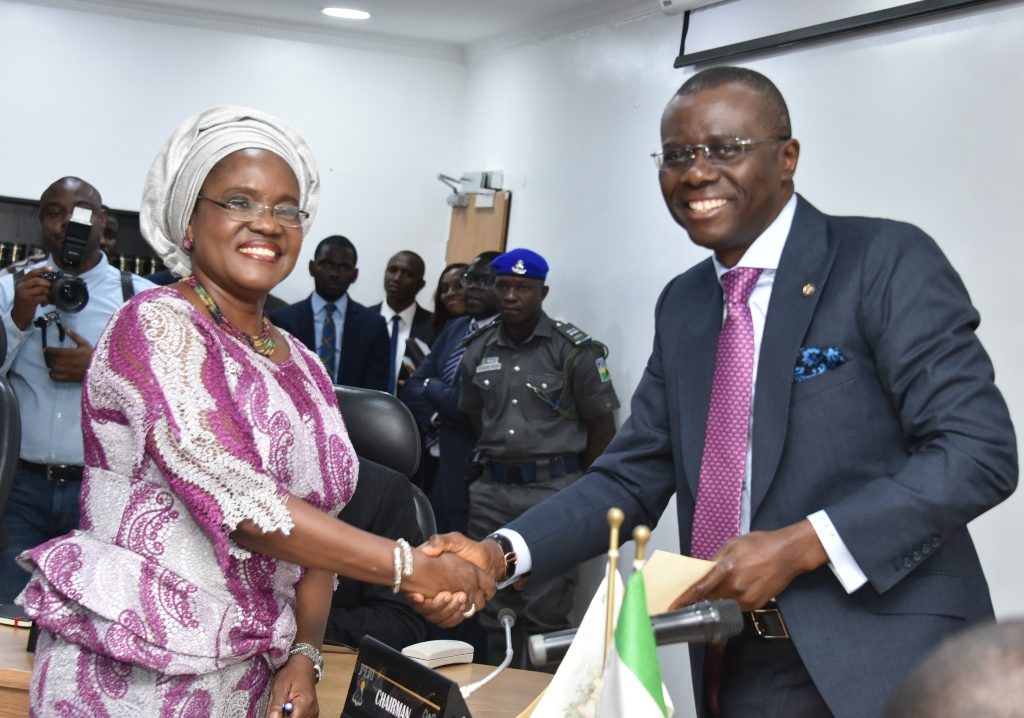 Lagos State Governor, Mr. Babajide Sanwo-Olu (right), congratulates the newly appointed Secretary to the State Government, Mrs. Folasade Jaji