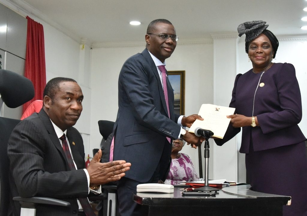 Lagos State Governor, Mr. Babajide Sanwo-Olu (middle), congratulates Mrs. Yewande Falugba as a Permanent Secretary