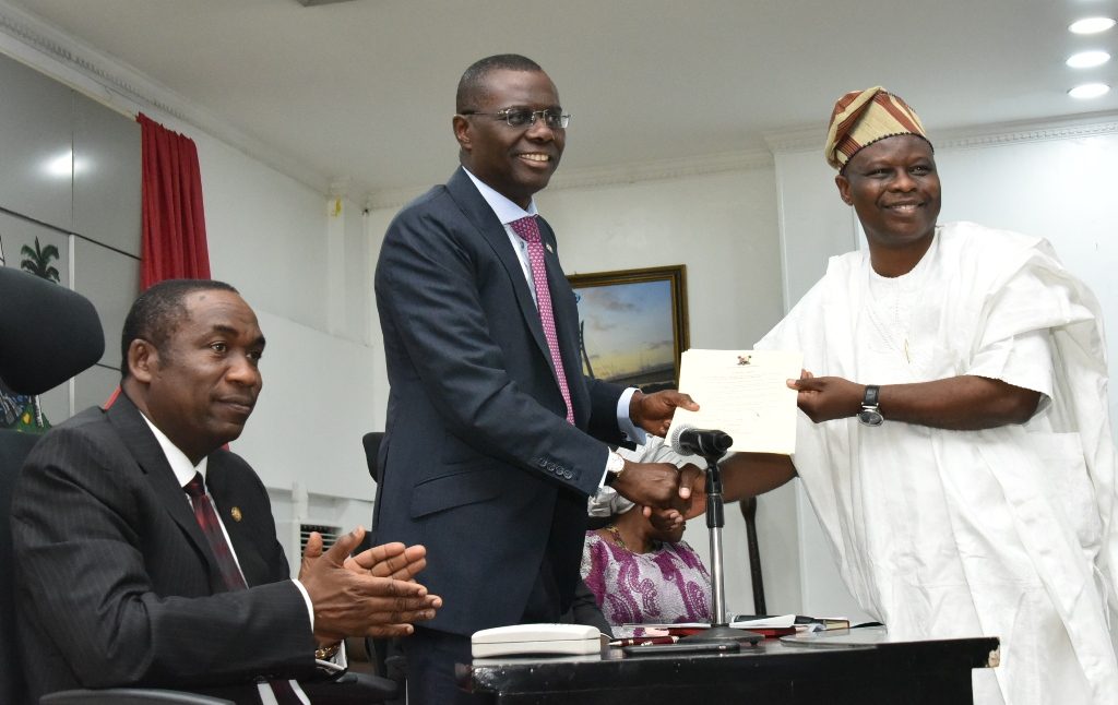 Lagos State Governor, Mr. Babajide Sanwo-Olu (middle), congratulates Mr. Wasiu Akewusola as a Permanent Secretary
