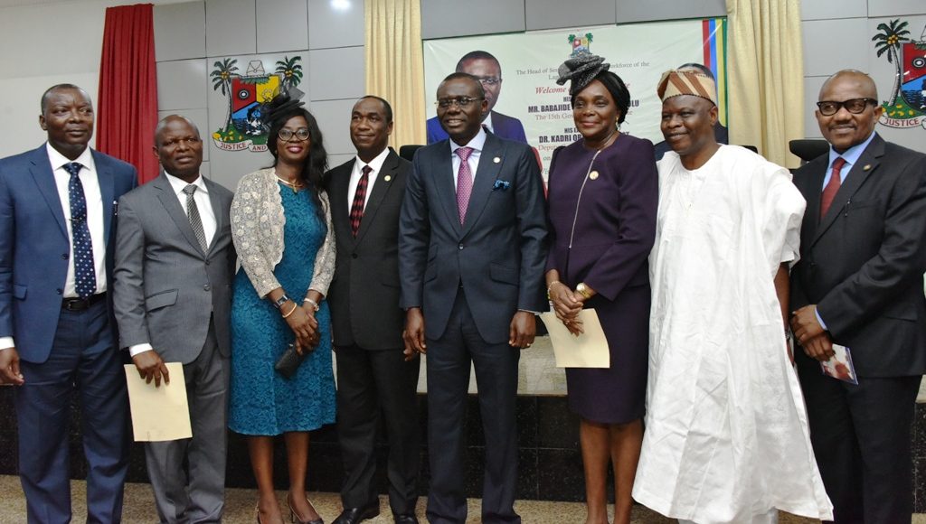 L-R: Newly appointed Permanent Secretaries, Dr. Eniayemo Ademuyiwa; Mr. Olumide Erinle; Mrs. Okelola Oluwadara; Lagos State Deputy Governor, Dr. Obafemi Hamzat; Governor Babajide Sanwo-Olu; Mrs. Yewande Falugba; Mr. Wasiu Akewusola and Mr. Mustapha Osi-Efa