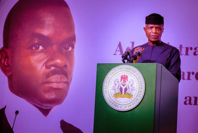 | Challenges affecting the administration of justice in Nigeria are being addressed and “there is much hope for the positive reform of the system as more result-oriented work is going on and some real changes expected”, according to Vice President Yemi Osinbajo, SAN. Prof. Osinbajo stated this Friday evening at the 20th year memorial anniversary symposium in honour of a resoundingly successful legal practitioner, Mr. Bankole Olumide Aluko, SAN, themed, “Administration of Justice: the Ideal Standard, the Nigeria Reality and Our Potential.” The Vice President who spoke on the issues of judicial appointments, delays in the dispensation of justice, democracy, and digitization in the judiciary, among others, noted that “the administration of justice system is the foundation of law and order, commerce and democracy.” On the delay of justice delivery, the VP submitted that addressing delays should “involve imposing sanctions by a more intentional regime for the award of adverse and wasted costs.” “The court is a taxpayer-funded public resource. The wasting or abuse of its finite time and resources without strict consequence will eventually discredit the system. “Adverse costs are paid to the successful party in a civil case and wasted costs are directed against legal practitioners for poor professional standards in the conduct of a case. “Severe costs should attend adjournments, there is no greater waste of taxpayer’s funds than for a scheduled case to have to be adjourned. It is only heavy costs that will discourage this malfeasance.” He noted that “certainty or predictability of judicial outcomes is one of the major strengths of the common law.” Regarding the impact of the law on democracy, Prof. Osinbajo noted that “the democratic rights of the people and their confidence in the notion of a government of the people, by the people, for the people, suffers when the system of electoral justice fails to see itself as a handmaid of the democratic process.” Citing the decision of the Supreme Court in the 2019 elections in Zamfara State to buttress his point, the VP noted that “to make sense, judicial decisions and reasoning must in most cases meet the common notions of fairness and justice. “The system of justice must recognize the larger principles that it serves. In judicial interpretation, the spirit is as important as the letter of the law. Otherwise, judicial decisions become technistic applications far removed from common sense. “The notions of justice that would meet public expectations of fairness and equity are those that promote substance over form. The observance of technicality over merit will always alienate the system of justice from the people it is meant to serve.” On the expectations from judicial officers, Prof. Osinbajo said “while we ask for the best from our judicial officers, we must equally ensure that the conditions under which they operate are not only befitting but are good enough to attract the best of minds in our profession.” In addition, the Vice President said the institution and infrastructure remain key to reforming the system, stating that “the judge is, of course, central to how our system of justice works. It is the court, not counsel that must determine the pace of cases.” On the process for judicial appointments, the VP stated that the robustness and transparency of the processes in other jurisdictions “provide comfort to the candidates of the fairness of the selection process; and enable the public to have front-row seat in some of these processes”, arguing that such a process be replicated in Nigeria. The VP extolled the late Aluko’s mastery of his craft, highlighted his varied abilities, and praised his contributions to the legal profession in the country. He described him as a truly iconic figure and recalled that “he was always my preferred lawyer.” Laolu Akande Senior Special Assistant to the President on Media & Publicity Office of the Vice President |
