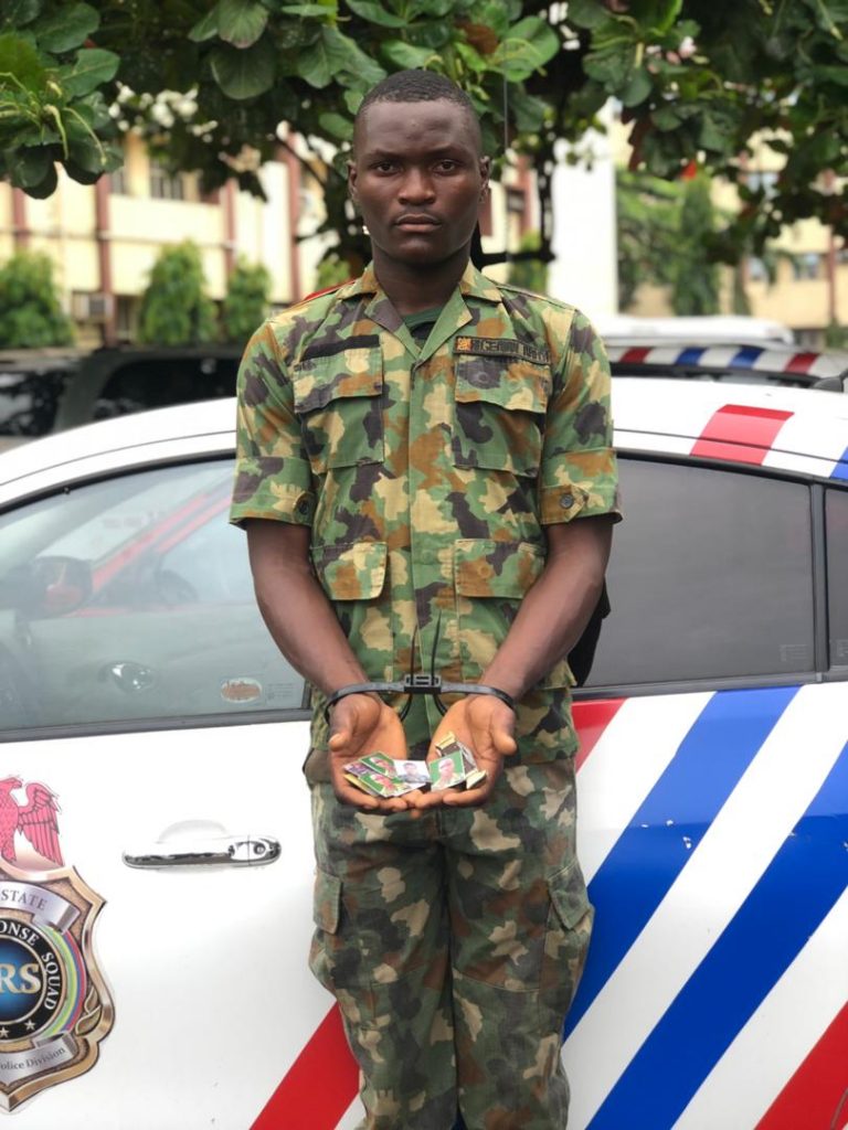 The operatives of the Rapid Response Squad (RRS), a unit of the Lagos State Police Command, on Wednesday arrested a fake soldier and a robber.