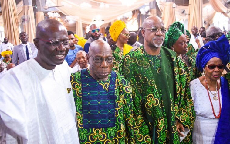 L-R: Governors, Senator Ademola Adeleke (Osun); Engr. Seyi Makinde (Oyo); Mr. Babajide Sanwo-Olu (Lagos State); wife of former President, Mrs. Bola Obasanjo; former President Olusegun Obasanjo and other dignitaries