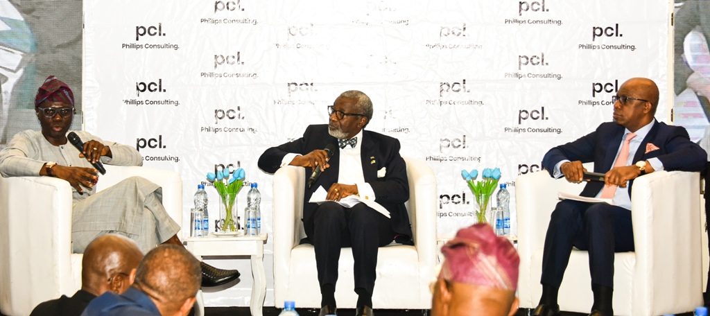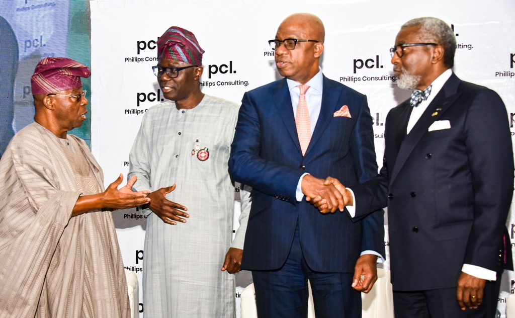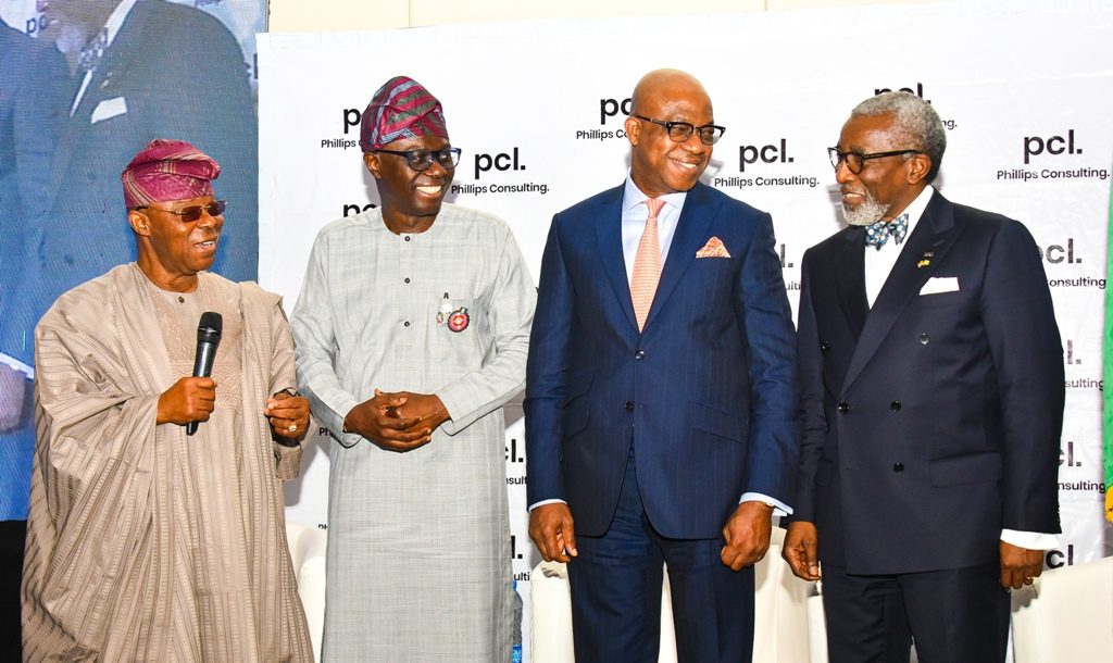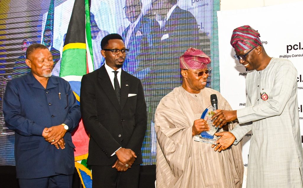 R-L: Lagos State Governor, Mr. Babajide Sanwo-Olu, receiving a plaque from the Chairman, Honeywell Group, Oba Otudeko; Managing Director, Phillips Consulting, Mr. Rob Taiwo and South Africa Consul-General in Lagos, Mr. Darkey Africa