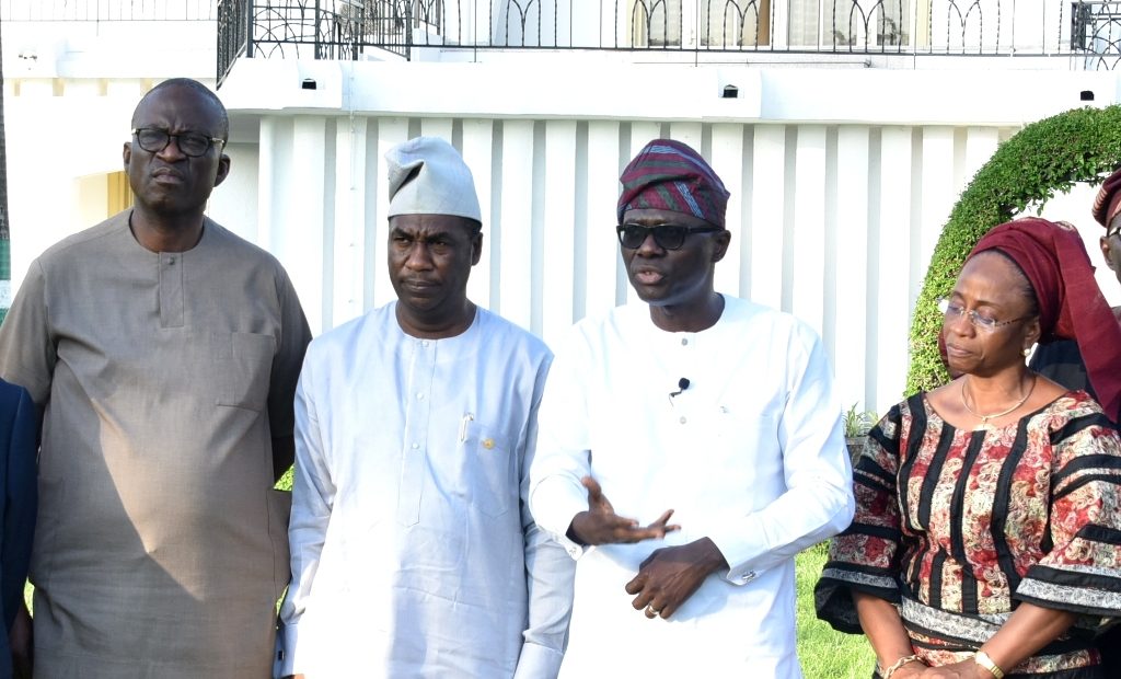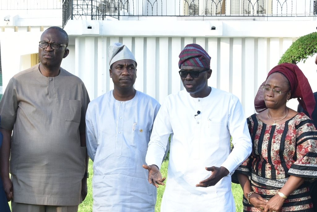 Lagos State Governor, Mr. Babajide Sanwo-Olu, addressing the Press on his declaration of emergency on road construction and rehabilitation. With him are Deputy Governor, Dr. Obafemi Hamzat (second left);Permanent Secretary, Ministry of Works and Infrastructure, Engr. Olujimi Hotonu (left) and Special Adviser to the Governor on Works and Infrastructure, Engr. (Mrs) Aramide Adeyoye (right).