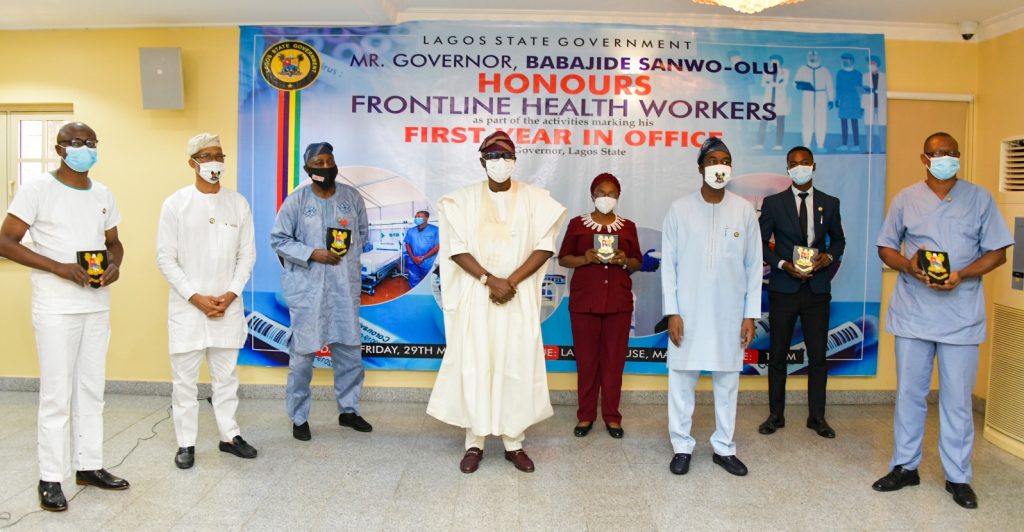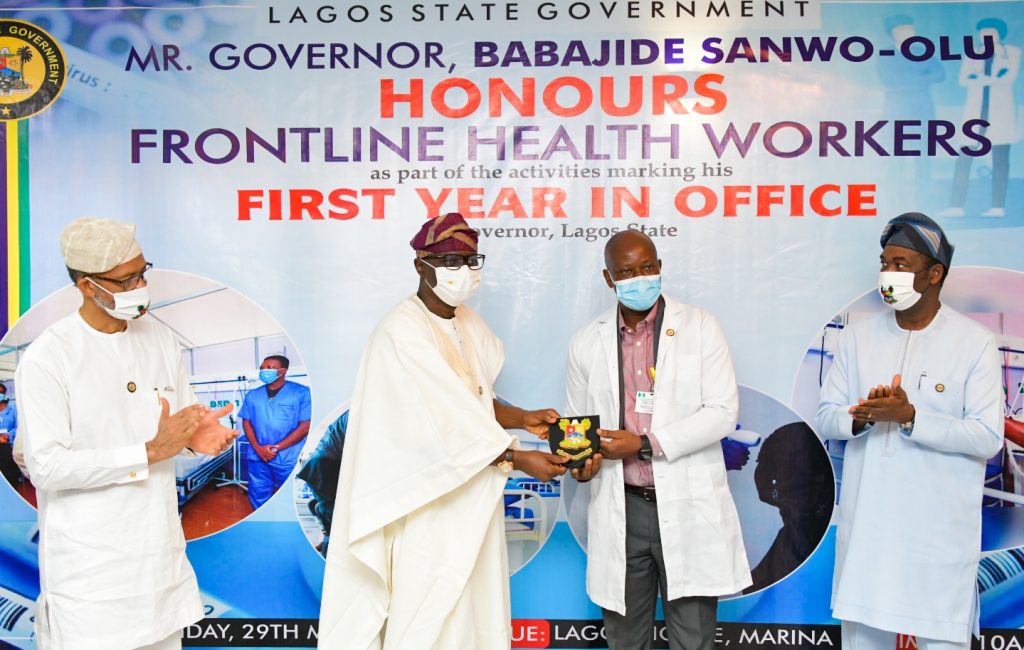 Governor Babajide Sanwo-Olu honoured leaders of various medical teams deployed to all isolation facilities across the State, presenting them with plaques of honour in appreciation of their resolve to lay down their lives in the battle against the pandemic.