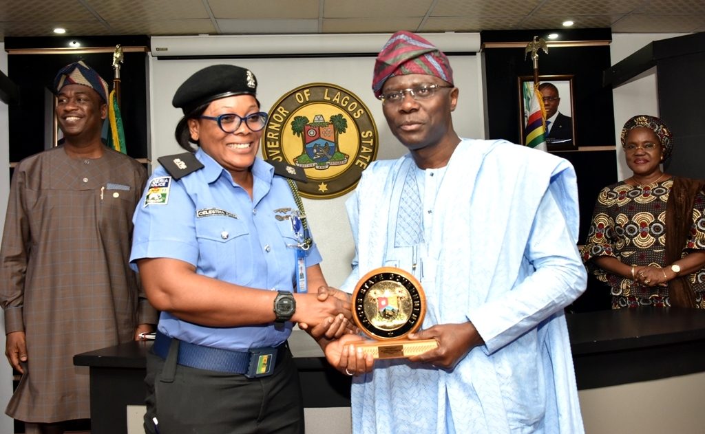 Lagos State Governor, Mr. Babajide Sanwo-Olu, presenting a plaque to Ogudu Divisional Police Officer, Superintendent Celestina Kalu, (2nd left). With them: Deputy Governor, Dr. Obafemi Hamzat (left) and Secretary to the State Government, Mrs. Folashade Jaji (right).