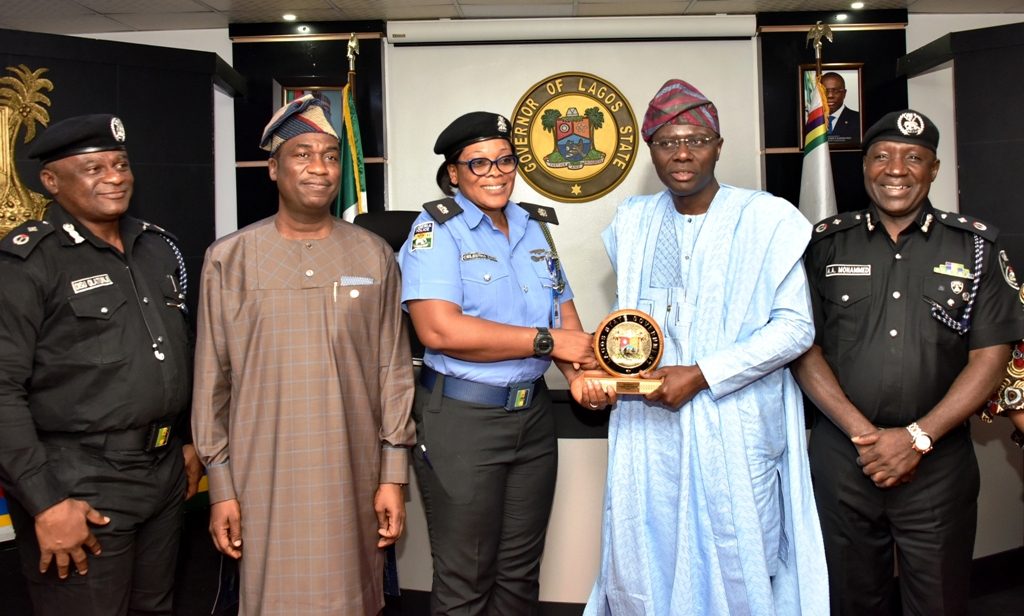 Lagos State Governor, Mr. Babajide Sanwo-Olu, presenting a plaque to Ogudu Divisional Police Officer, Superintendent Celestina Kalu, (3rd left) who is being recognised and commended for her exemplary conduct in the discharge of her duty at Lagos House, Alausa, Ikeja, on Monday, October 7, 2019. With them: Deputy Governor, Dr. Obafemi Hamzat (2nd left); Commander, Rapid Response Squad, DCP. Tunji Disu (left); Deputy Commissioner of Police, Operations, Lagos Police Command, Mr. Alli Muhammed and Secretary to the State Government, Mrs. Folashade Jaji.