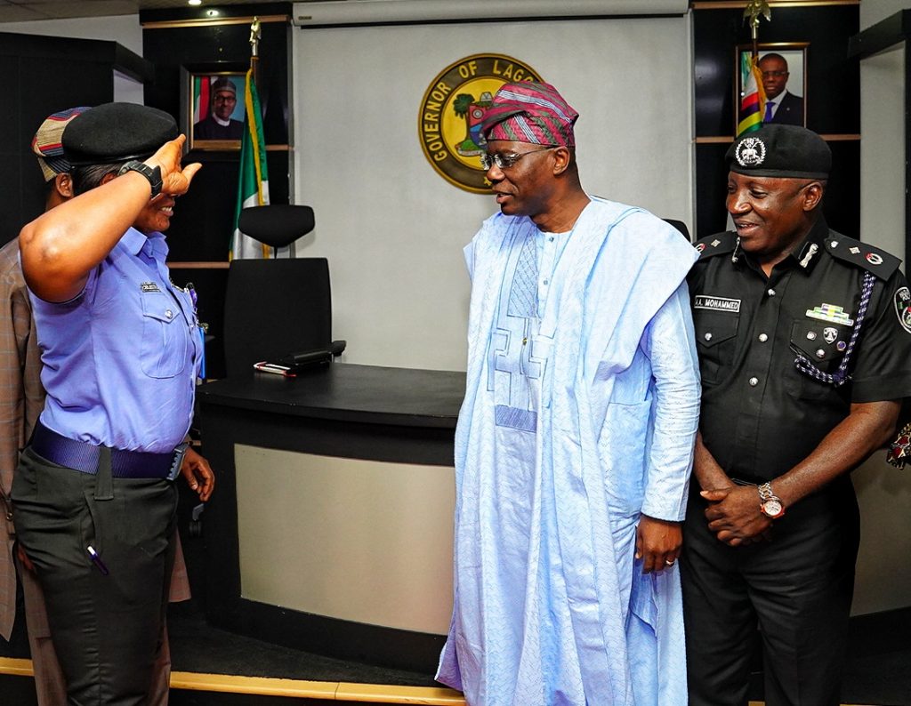 L-R: Ogudu Divisional Police Officer, Superintendent Celestina Kalu, saluting Lagos State Governor, Mr. Babajide Sanwo-Olu while Deputy Commissioner of Police, Operations, Lagos Police Command, Mr. Alli Muhammed