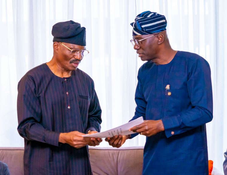 Lagos State Governor, Mr. Babajide Sanwo-Olu (right) handing over the State condolence letter to Mr. Adeyemi Nelson, husband of late APC Chieftain Chief (Mrs) Kemi Nelson