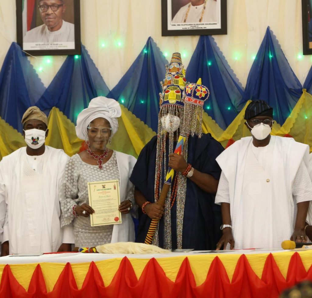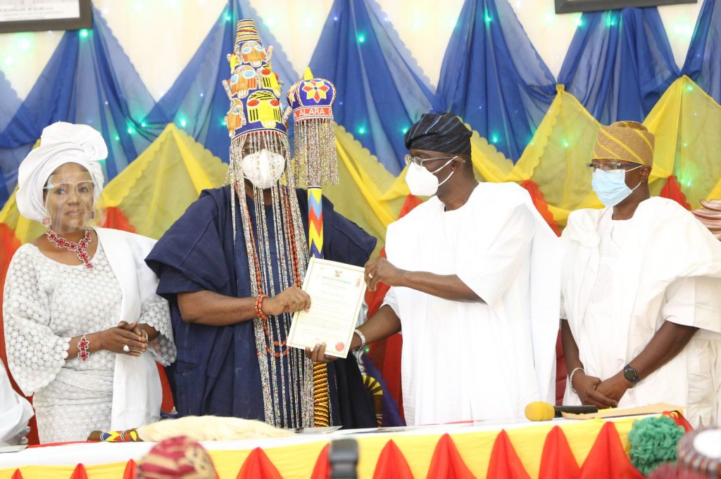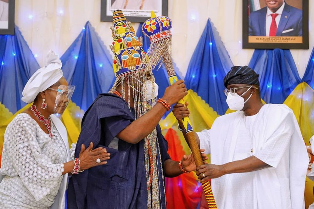 Lagos State Governor, Mr. Babajide Sanwo-Olu on Sunday presented Staff of Office and Instrument of Appointment to Oba Olufolarin Olukayode Ogunsanwo, the Alara of Ilara in Eredo Local Council Development Area (LCDA) of the State.