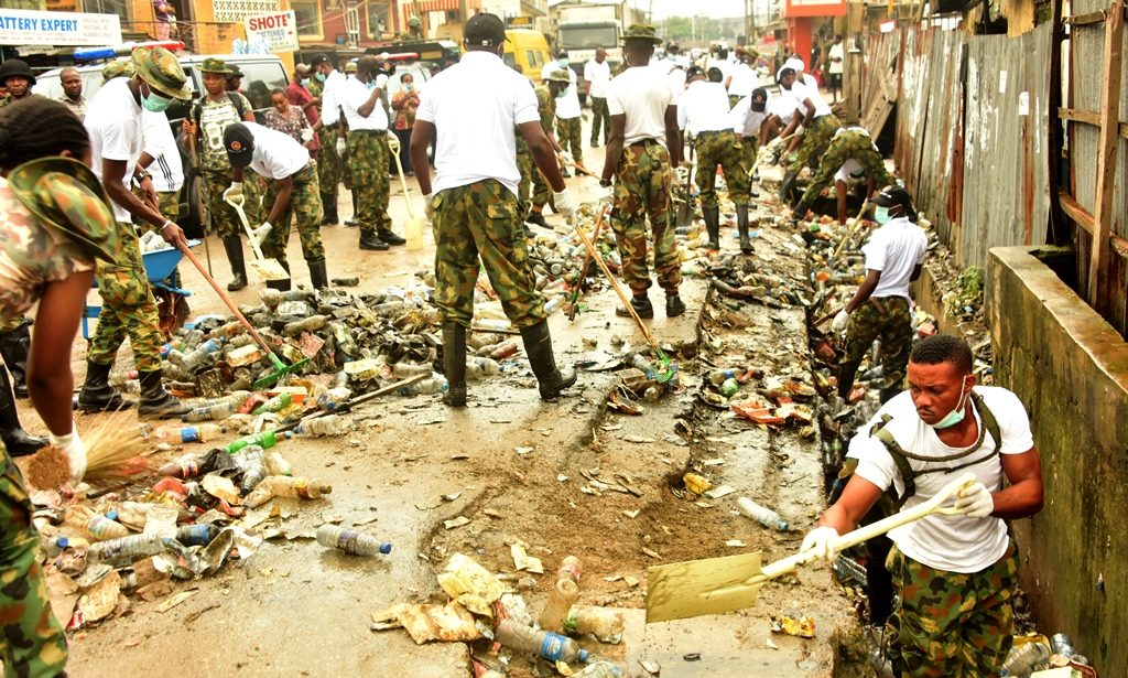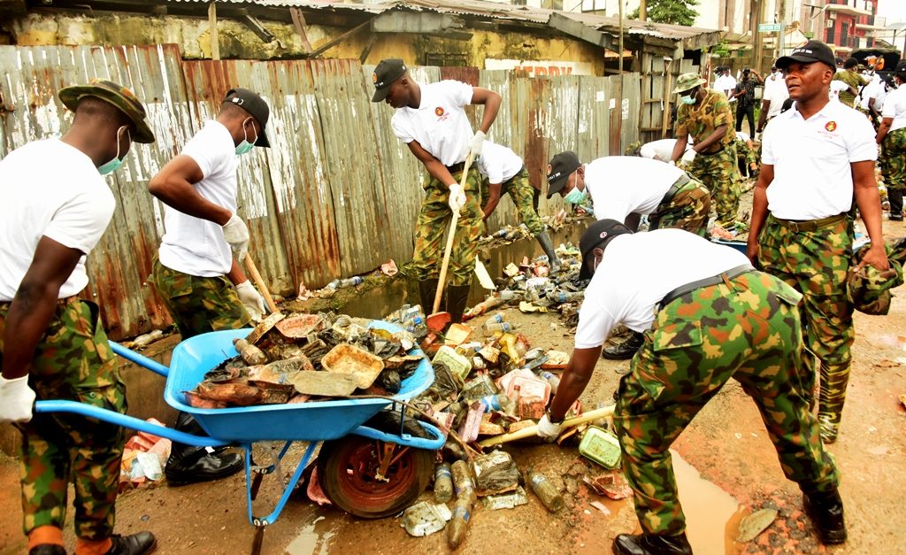 A battalion of military personnel from the 81 Division of the Nigerian Army swarmed the neighbourhood in early hours for environmental sanitation, cleaning streets of filth.