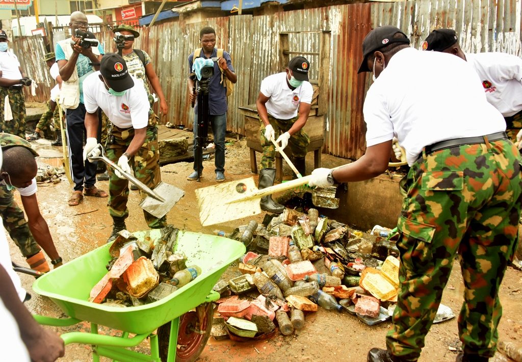 Led by the Commander of 9 Brigade in Ikeja, Brigadier-General Nasir Mohammed Jega, the troops moved to the area with sanitation materials, including shovels, rakes and wheelbarrows, to carry the exercise organised in commemoration of the Nigerian Army Day.
