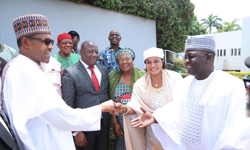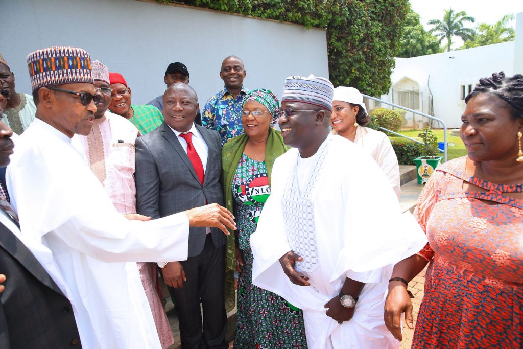 Ppresident Muhammadu Buhari in a handshake with NLC President, Comrade Ayuba Wabba, 2nd Deputy President NLC, Augustine Etafor, Najeem Usman Yasin, Musa Lawal, Chinedu Okoronko, Nasiru Idris F.O Johnson. With the President are Chief of Staff, Mallam Abba Kyari, Minister of Interior, Lt General Abdulrahman Dambazzau Rtd, Minster of Labour and Employment, Senator Chris Ngige and others