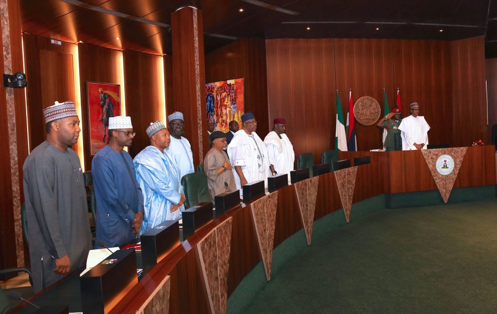 R-L; President Muhammadu Buhari, Chief of Staff Mallam Abba Kyari, Minister of Interior, Lt General Abdulrahman Dambazzau, Minister of Labour and Employment, Sen Chris Ngige and others
