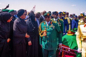 President Tinubu and other dignitaries, including Vice President Kashim Shettima, President Umaru Sissoco Embalo of Guinea-Bissau, Prime Minister of Niger Republic, Ali Lamine Zeine, former President of Niger Republic, Issoufou Mahamadou, former Vice President Yemi Osinbajo, governors and business leaders, escorted the late President’s remains on the hour-long drive to Daura.