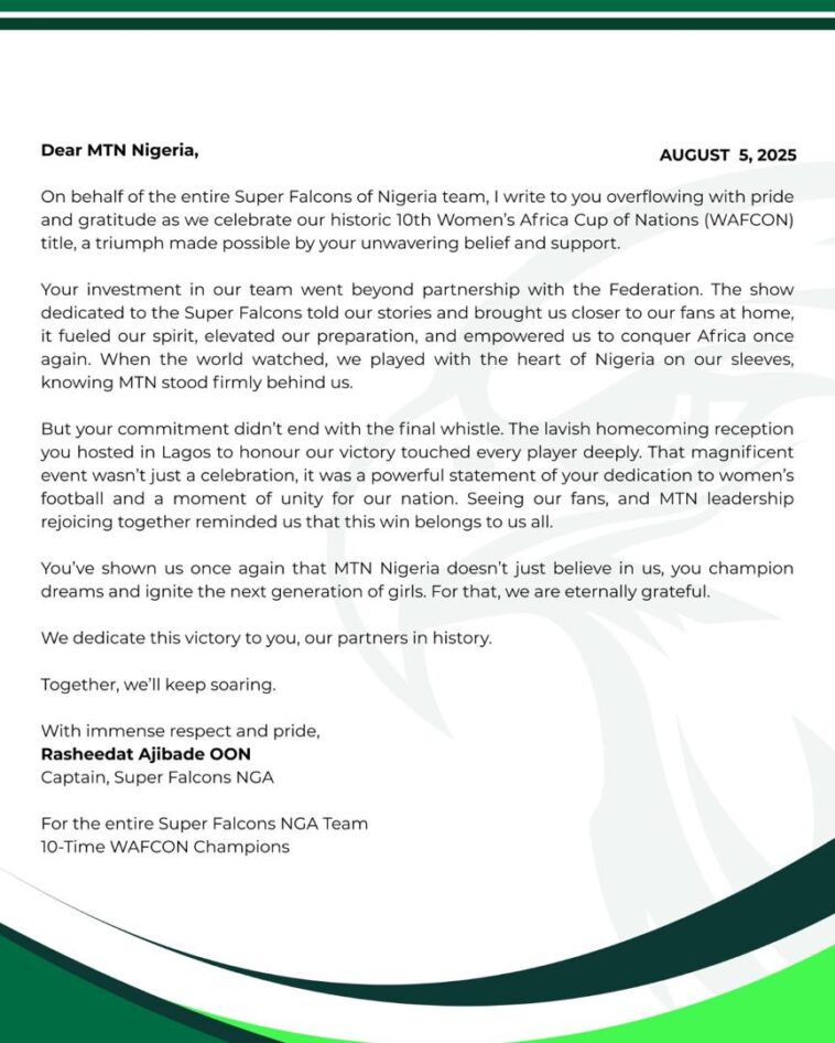 In the letter, the Super Falcons, now 10-time WAFCON champions, described MTN’s role as more than sponsorship. In their message, they referenced the company’s presence throughout their journey, from pre-tournament preparation to the warm reception at MTN’s Ikoyi headquarters, and the public celebration upon their return from Morocco.