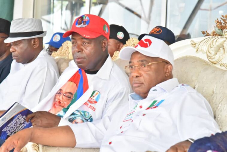 From right: Governor Hope Uzodimma, Convener of Imo Political Movement (IPM)/House of Representatives member for Ohaji/Egbema, Oguta/Oru West Federal Constituency, Hon. Eugene Dibiagwu and former Governor of Imo State, Chief Ikedi Ohakim,