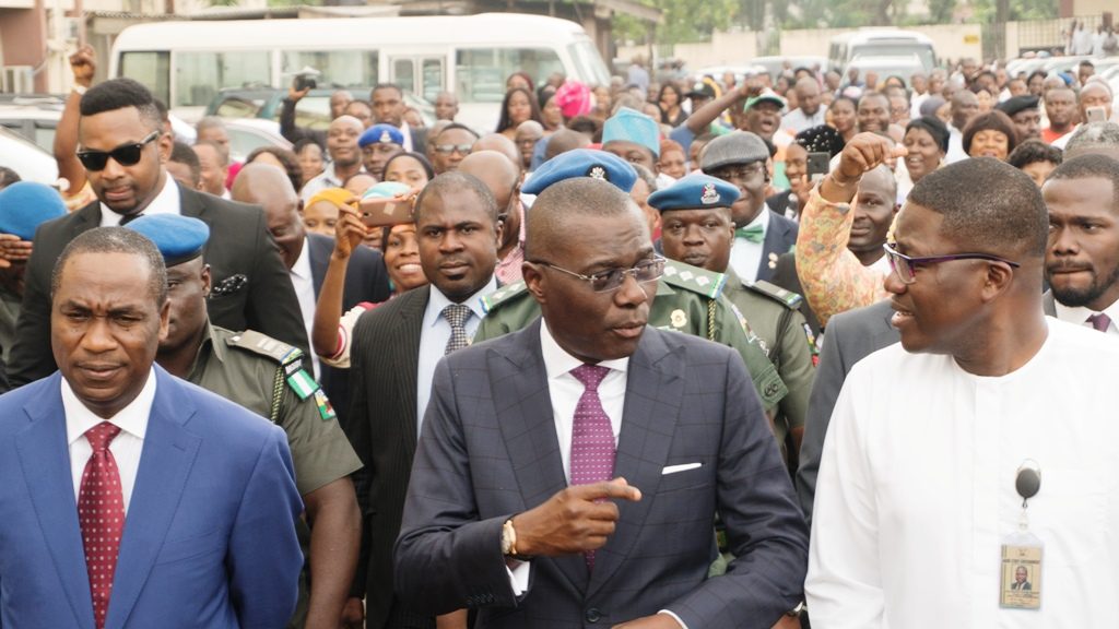 The Governor, who was accompanied by the Deputy Governor, Dr. Obafemi Hamzat and the Head of Service (HOS), Mr. Hakeem Muri-Okunola acknowledged the rousing welcome from Civil Servants and heads of parastatals who had gathered as early as 8a:m to receive him (the Governor).