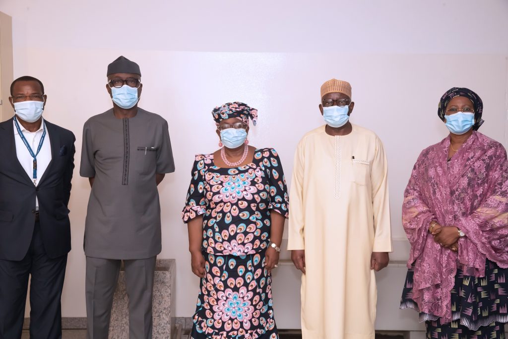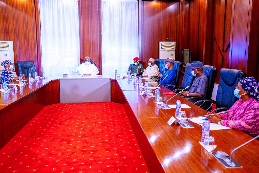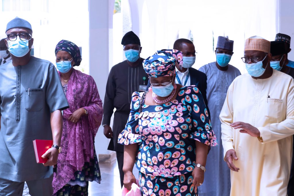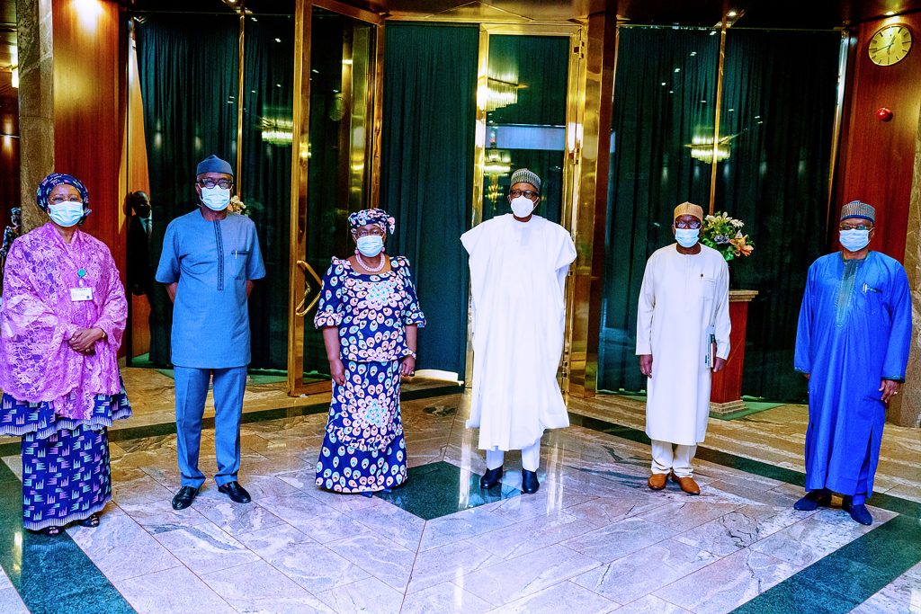 PRESIDENT BUHARI RECEIVES OKONJO-IWEALA 6. L-R; Minister of Industry, Otunba Niyi Adebayo, Minister of Industry, Trade and Investment, Dr Mariam Katagum, Dr Humphrey Orjiako, Chief of Staff, Prof Ibrahim Gambari, Former Coordinating Minister of the Economy, Minister of Finance, WTO Top contender, Dr Ngozi Okonjo-Iweala and others during an audience with President Buhari at the State House Abuja. PHOTO; SUNDAY AGHAEZE. OCT 12 2020.