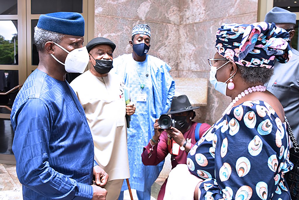 PRESIDENT BUHARI RECEIVES OKONJO-IWEALA 2. From left: Vice President Yemi Osinbajo SAN with Minister of Labour and Employment, Sen Chris Ngige; Special Assistant To the President on Youth and Student Affairs, Hon Nasir Adhama; Top Contender for the Position of Director General, World Trade Organisation (WTO)/ Former Minister of Finance and Coordinating Minister of the Economy, Dr Ngozi Okonjo-Iweala During on arrival of Dr Okonjo-Iweala to the Presidential Villa in Abuja on Monday. PHOTO; SUNDAY AGHAEZE. OCT 12 2020