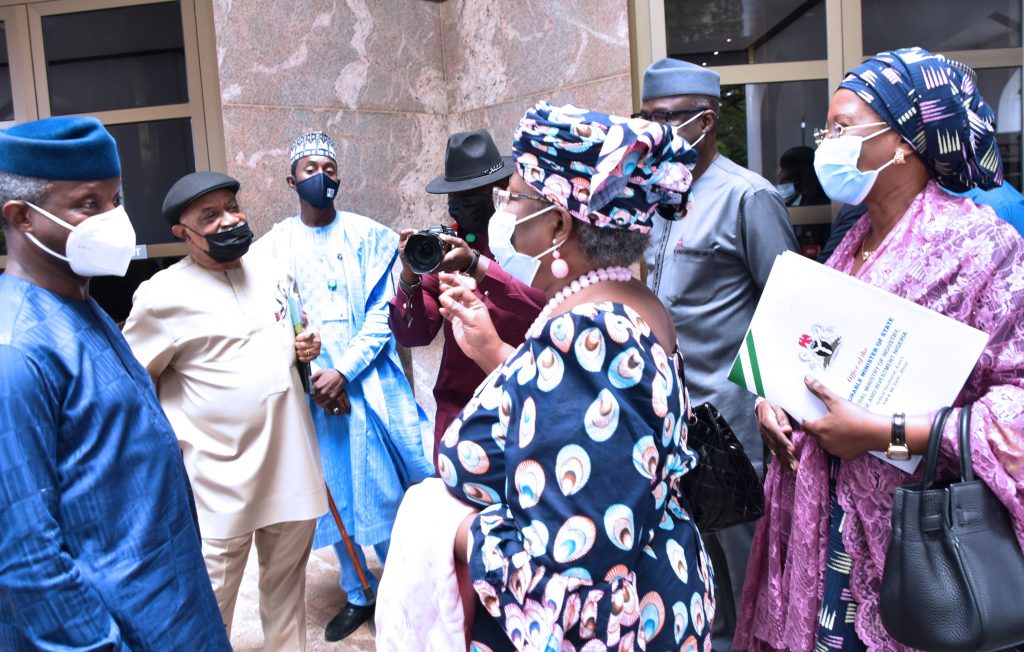 PRESIDENT BUHARI RECEIVES OKONJO-IWEALA 2B. From left: Vice President Yemi Osinbajo SAN with Minister of Labour and Employment, Sen Chris Ngige; Special Assistant To the President on Youth and Student Affairs, Hon Nasir Adhama; Top Contender for the Position of Director General, World Trade Organisation (WTO)/ Former Minister of Finance and Coordinating Minister of the Economy, Dr Ngozi Okonjo-Iweala; Minister of Industry, Trade and Investment, Mr Niyi Adebayo and Minister of State for Industry, Trade and Investment, Hajiya Mariam Katagum During on arrival of Dr Okonjo-Iweala to the Presidential Villa in Abuja on Monday. PHOTO; SUNDAY AGHAEZE. OCT 12 2020