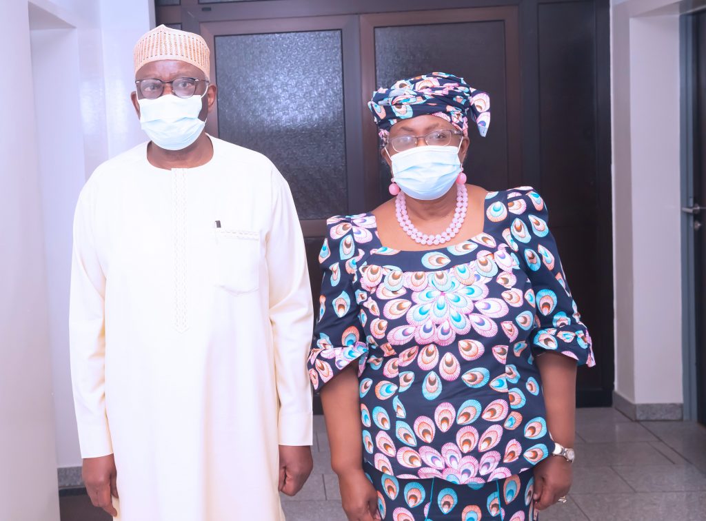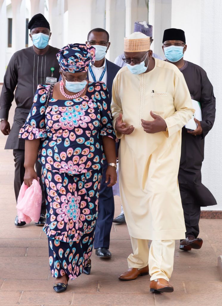 PRESIDENT BUHARI RECEIVES OKONJO-IWEALA 3. R; Chief of Staff to the President, Prof Ibrahim Gambari and Former Coordinating Minister of the Economy, Minister of Finance, WTO Top contender, Dr Ngozi Okonjo-Iweala during an audience with President Buhari at the State House Abuja. PHOTO; SUNDAY AGHAEZE. OCT 12 2020.